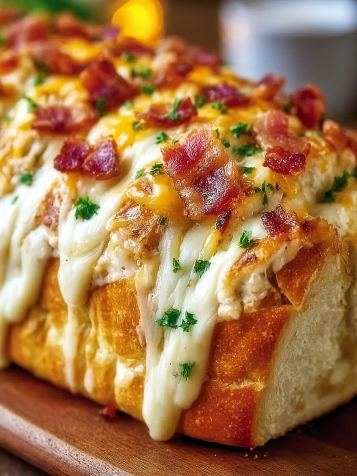 A deliciously cheesy and savory bread loaf stuffed with crispy bacon, perfect for sharing!