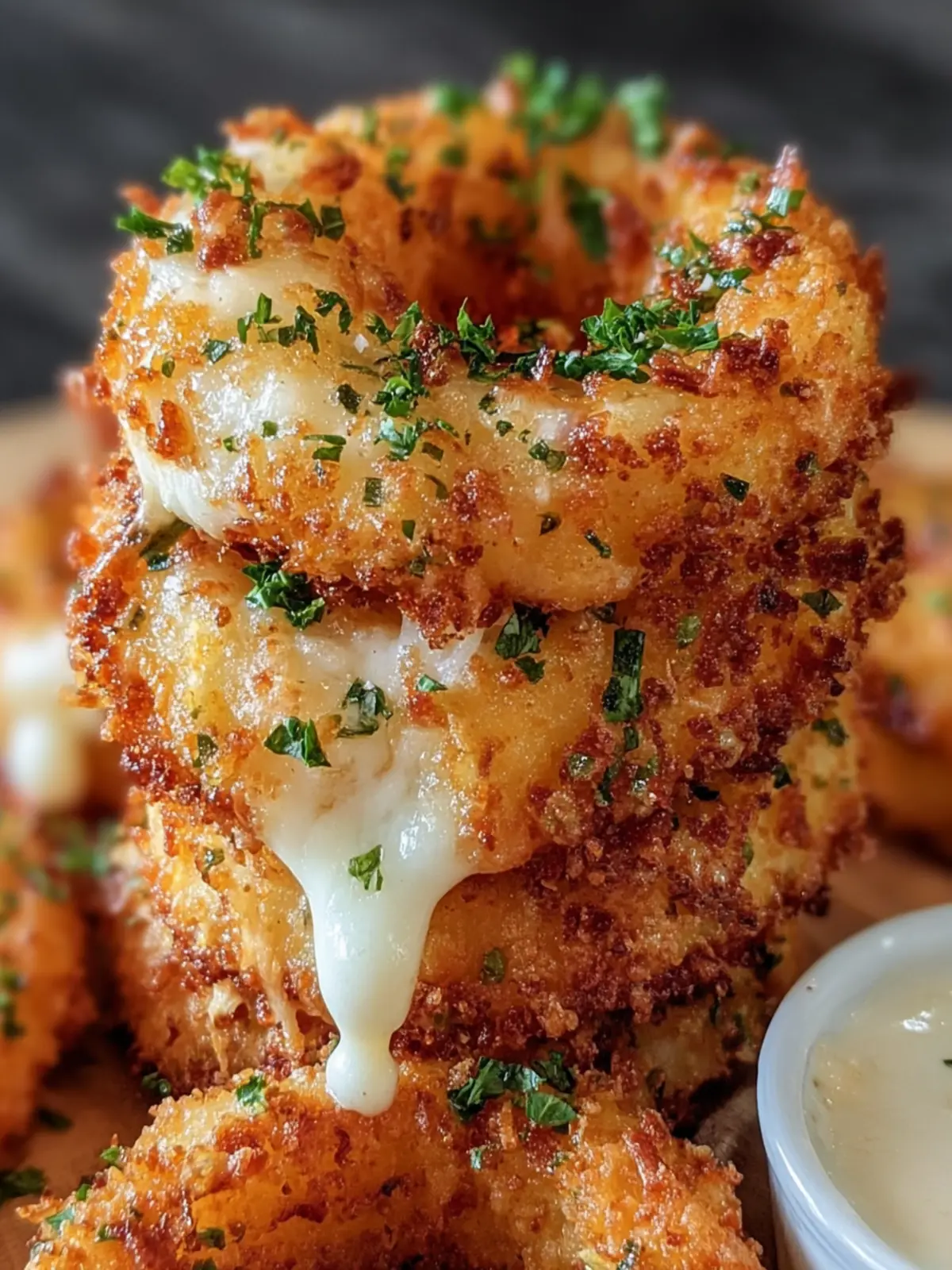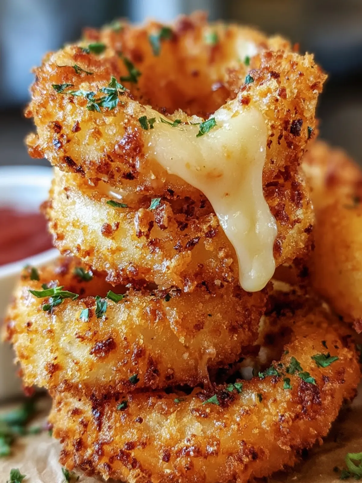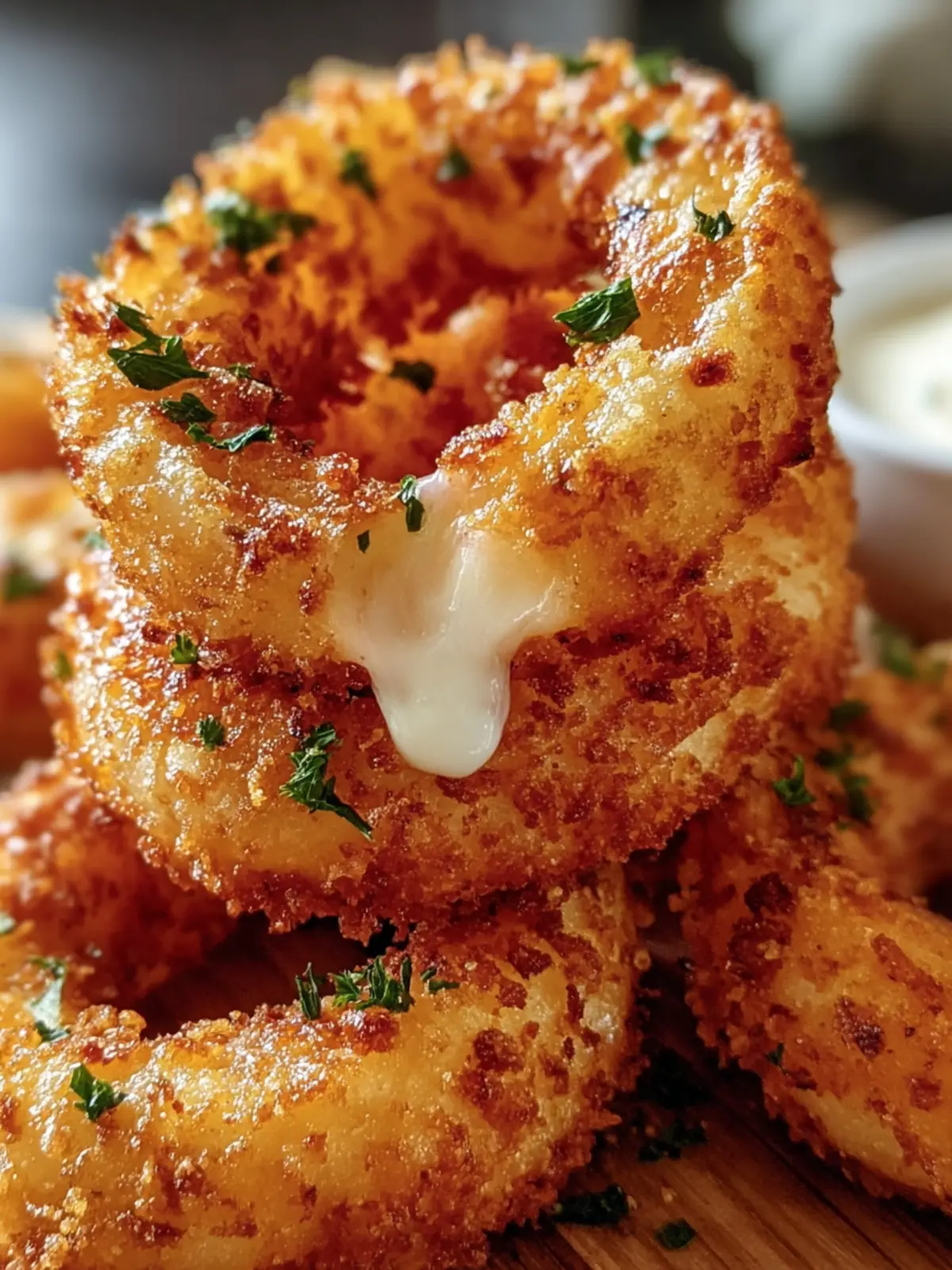 Deliciously crispy onion rings filled with mozzarella cheese and coated with a flavorful breadcrumb mixture.