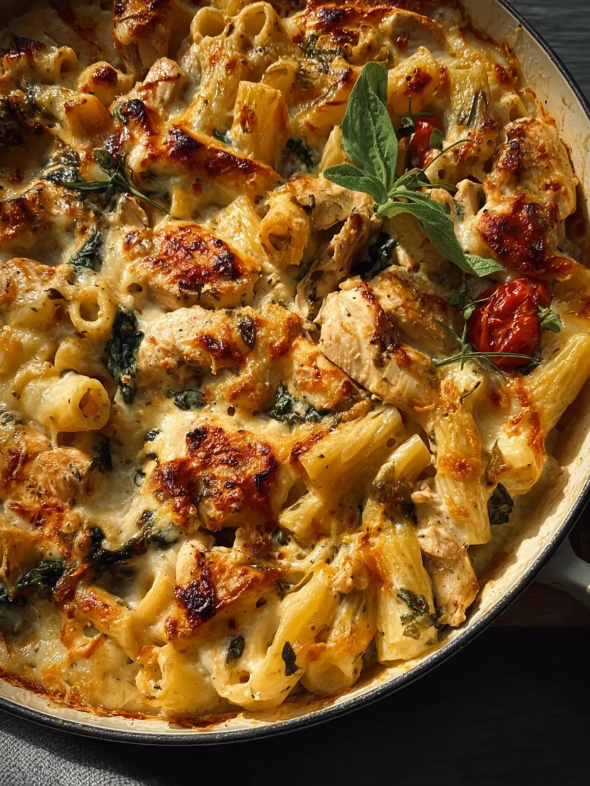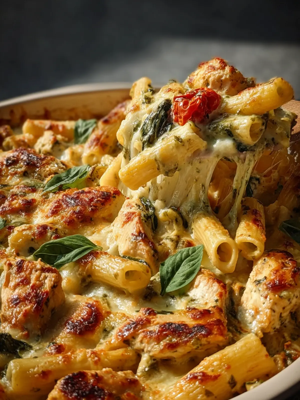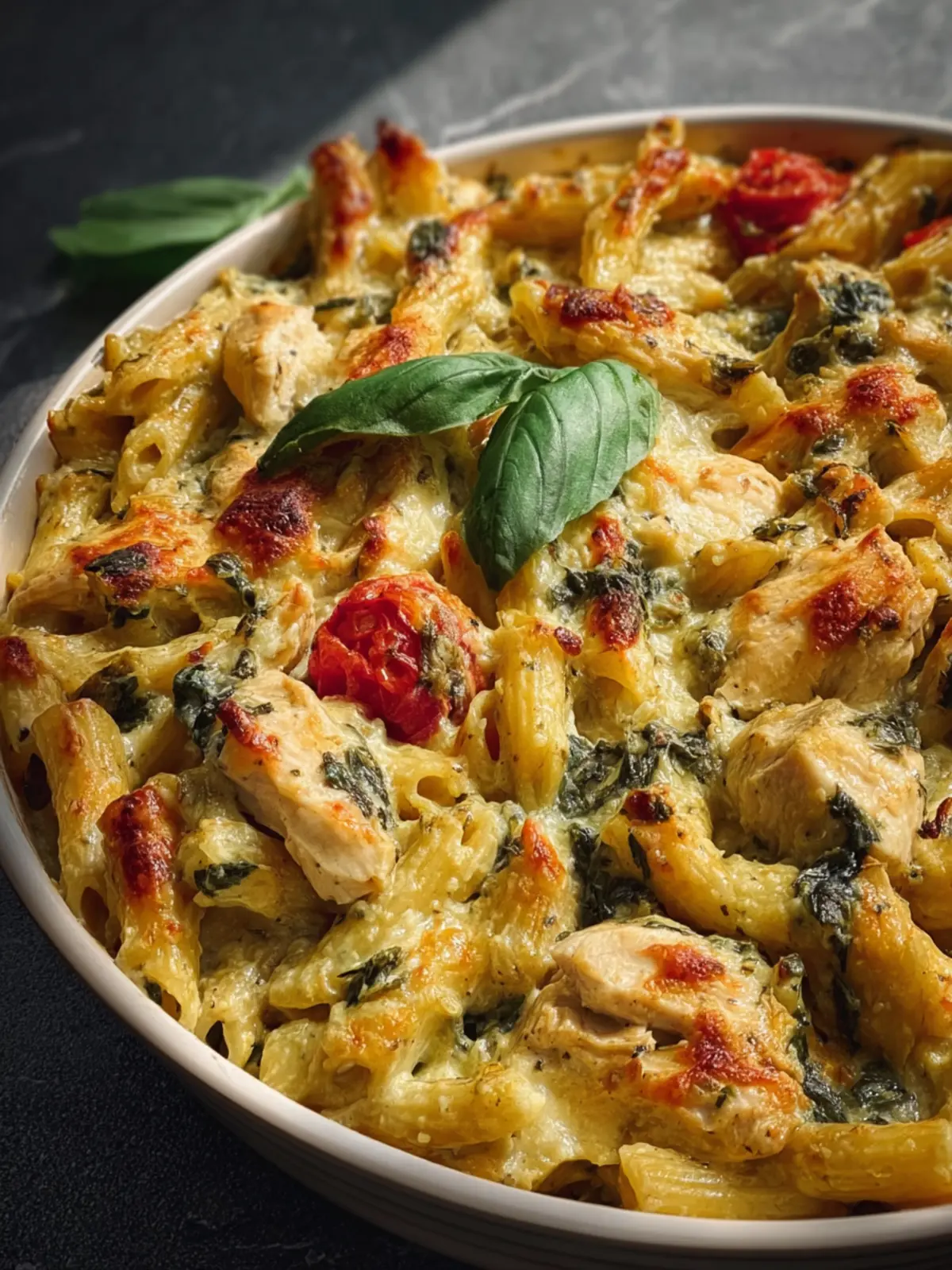 A delightful creamy pasta dish with chicken, spinach, and basil pesto, baked to perfection.
