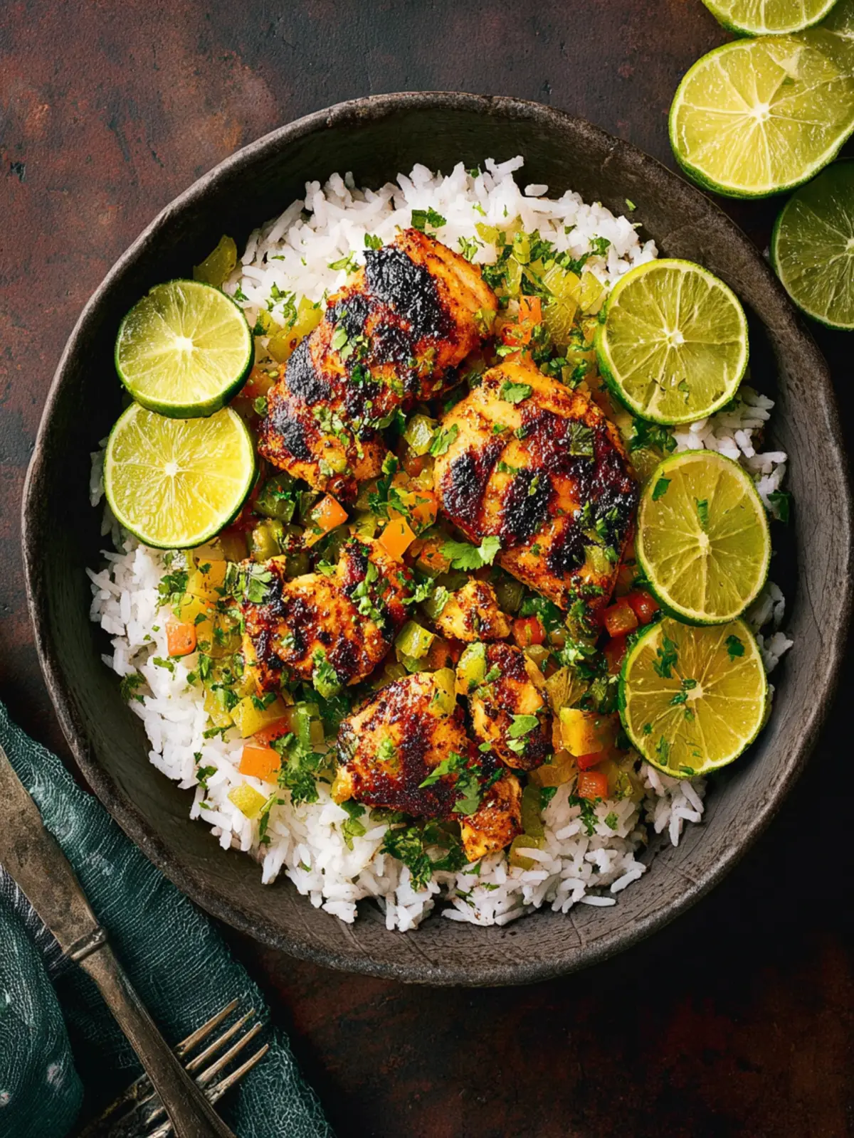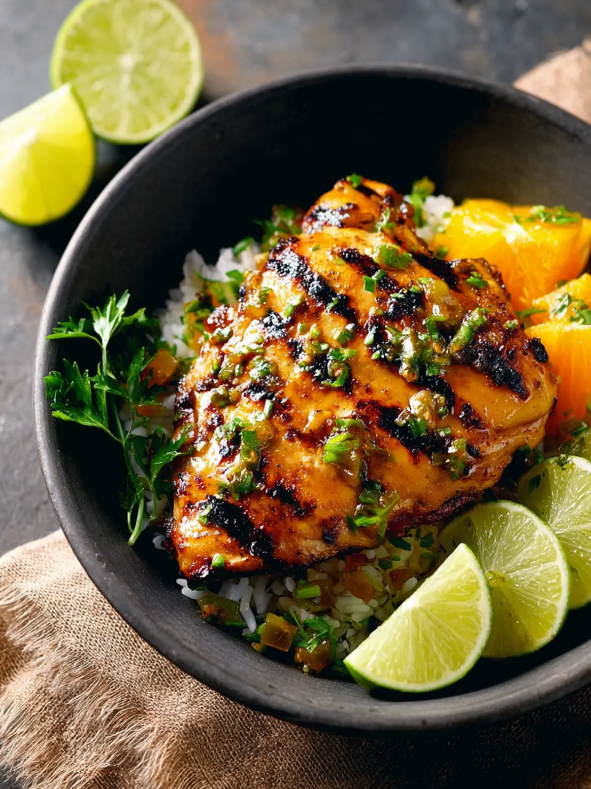 - In separate bowls, layer the cilantro-lime rice, grilled chicken, and citrus avocado salsa. Top with lime wedges and fresh cilantro as desired.
