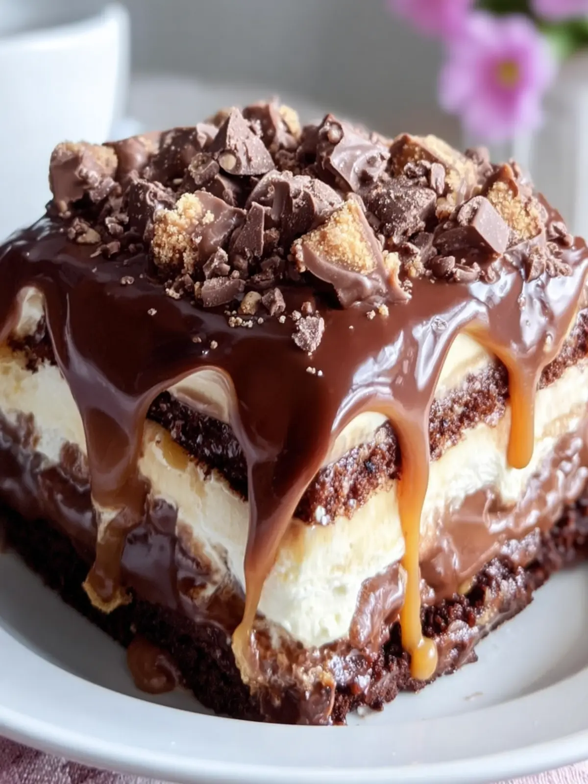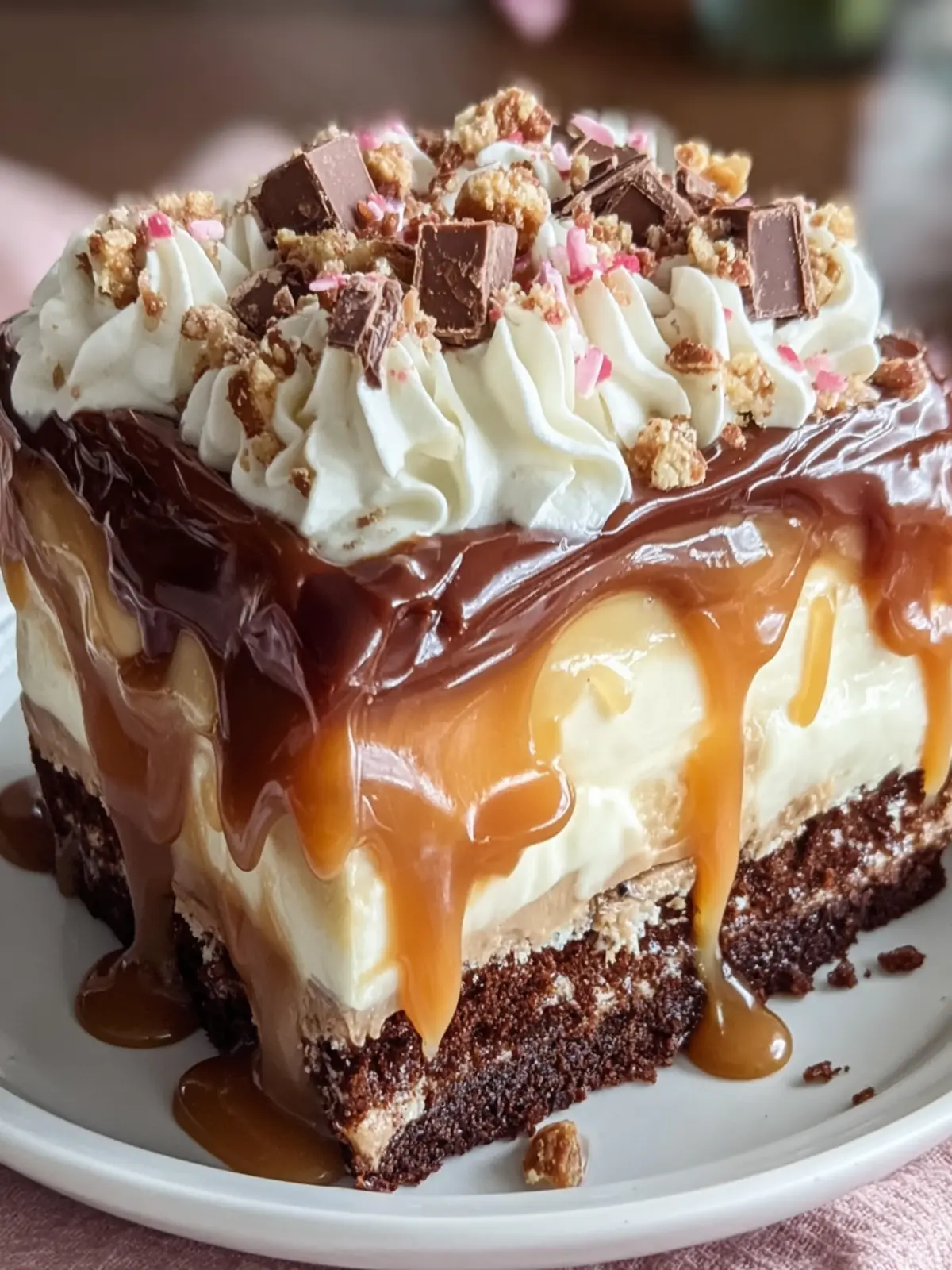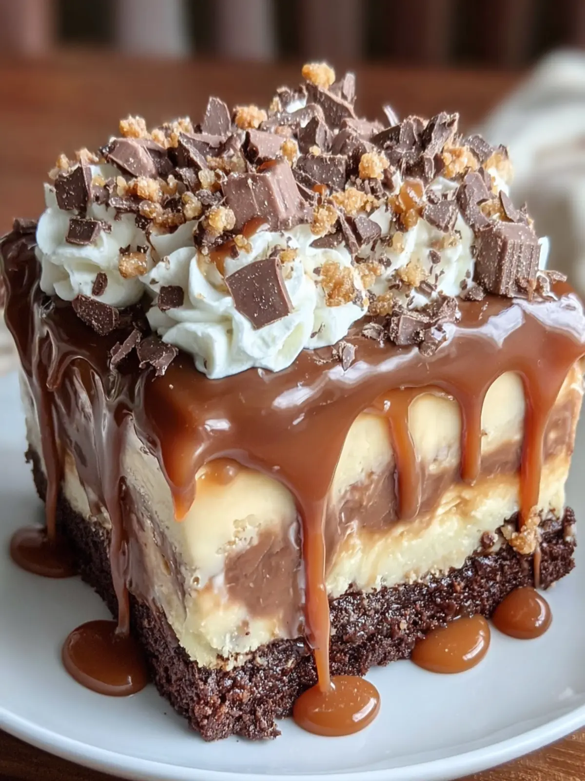 A rich and indulgent layered cake featuring chocolate, caramel, and whipped cream.