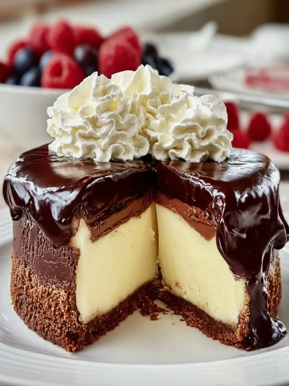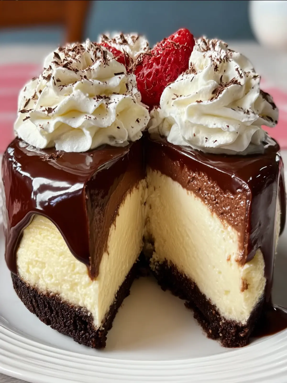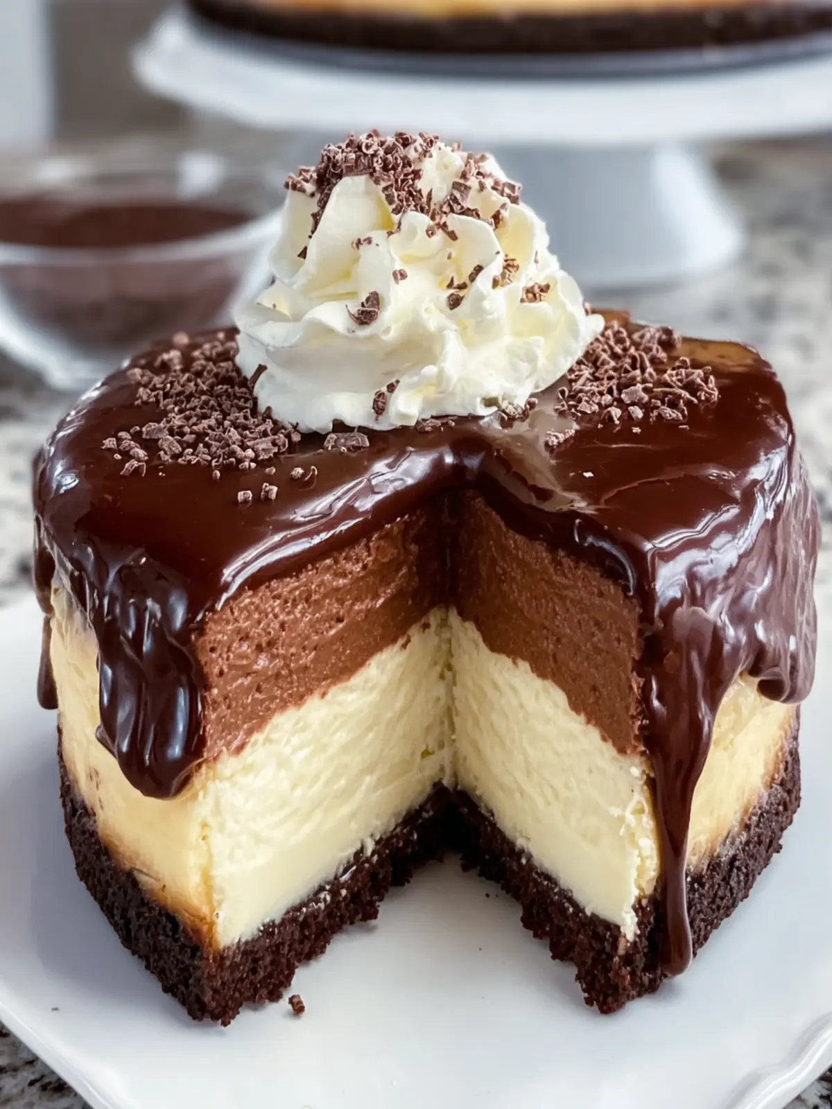 A rich and creamy chocolate cheesecake topped with a luscious ganache and whipped cream.
