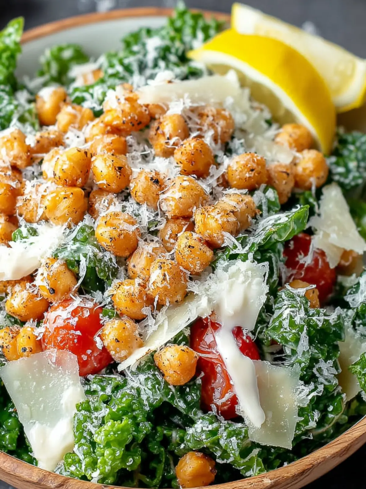As you toss together the ingredients, savor the olive oil’s rich aroma and the tang of fresh lemon juice—the kind of zest that sets your taste buds dancing. This salad invites you to enjoy the crispiness of roasted chickpeas alongside the robust flavors of parmesan and a creamy dressing.