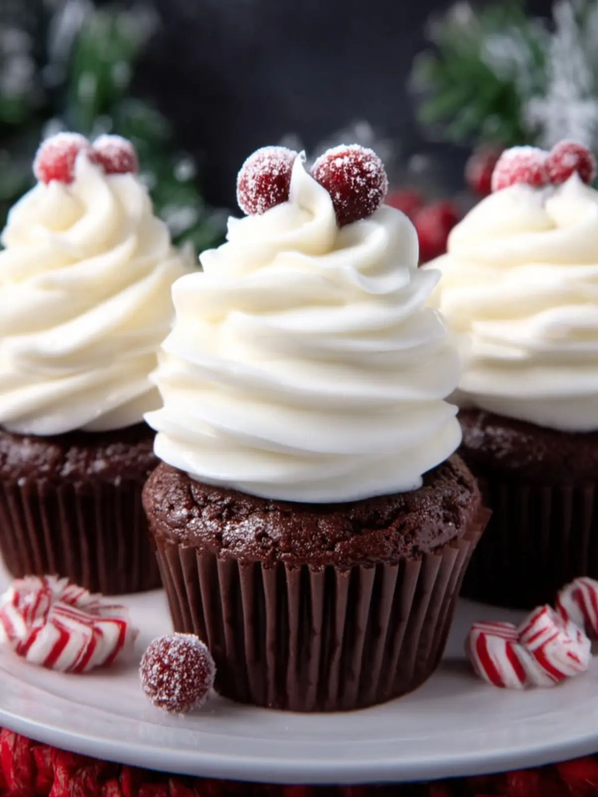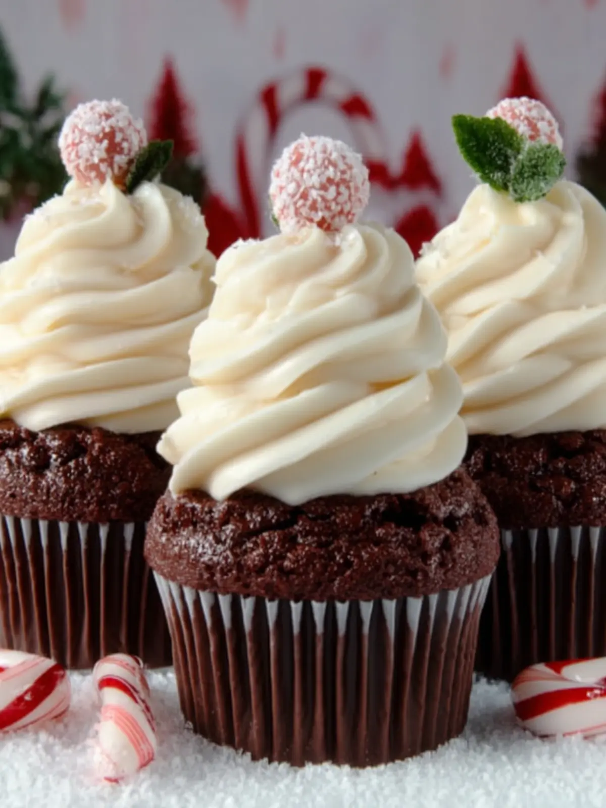Delicious holiday-themed chocolate cupcakes topped with a creamy peppermint frosting and festive decorations.