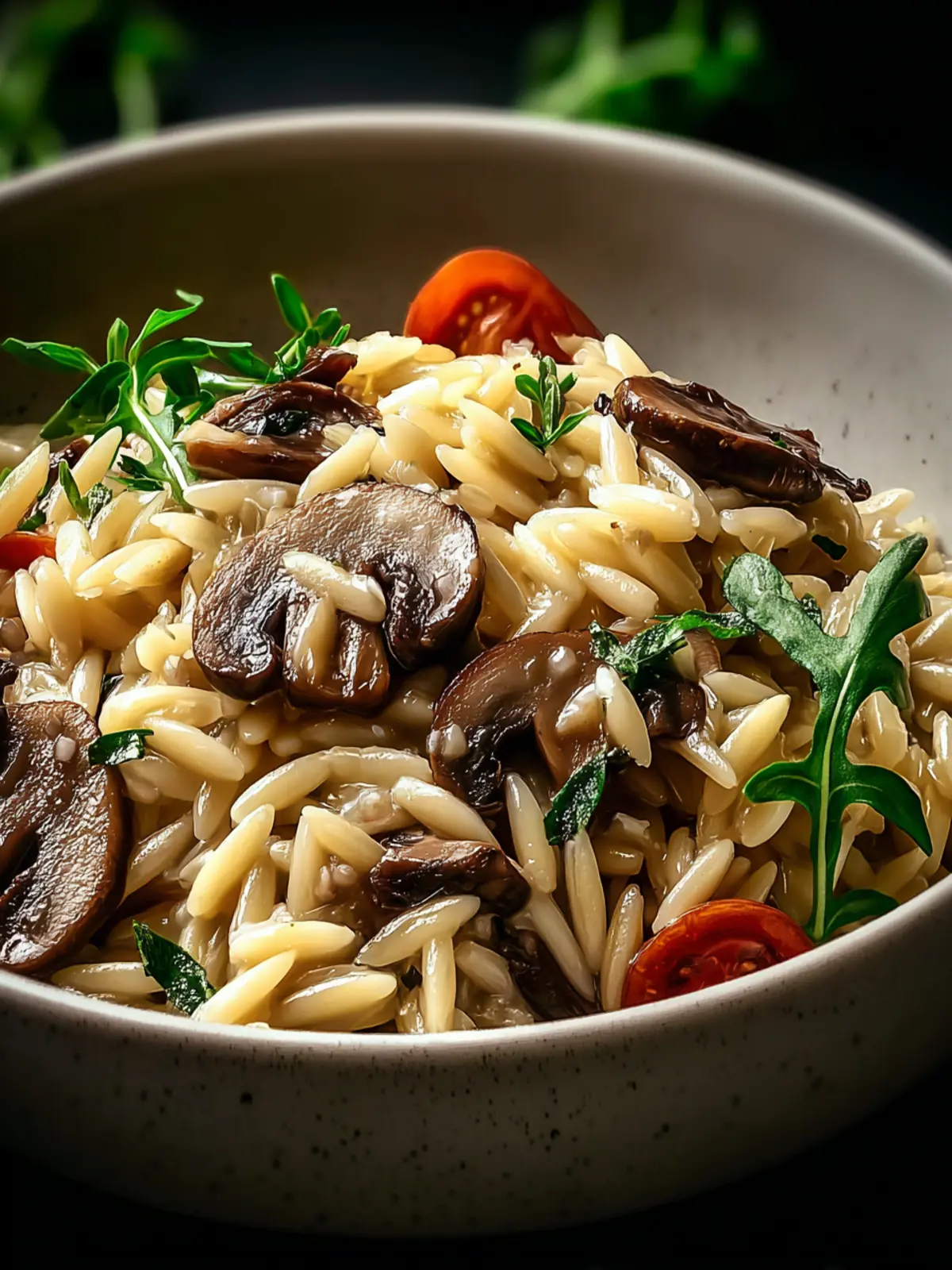 A rich and creamy orzo pasta dish with sautéed mushrooms and garlic, perfect for a comforting meal.