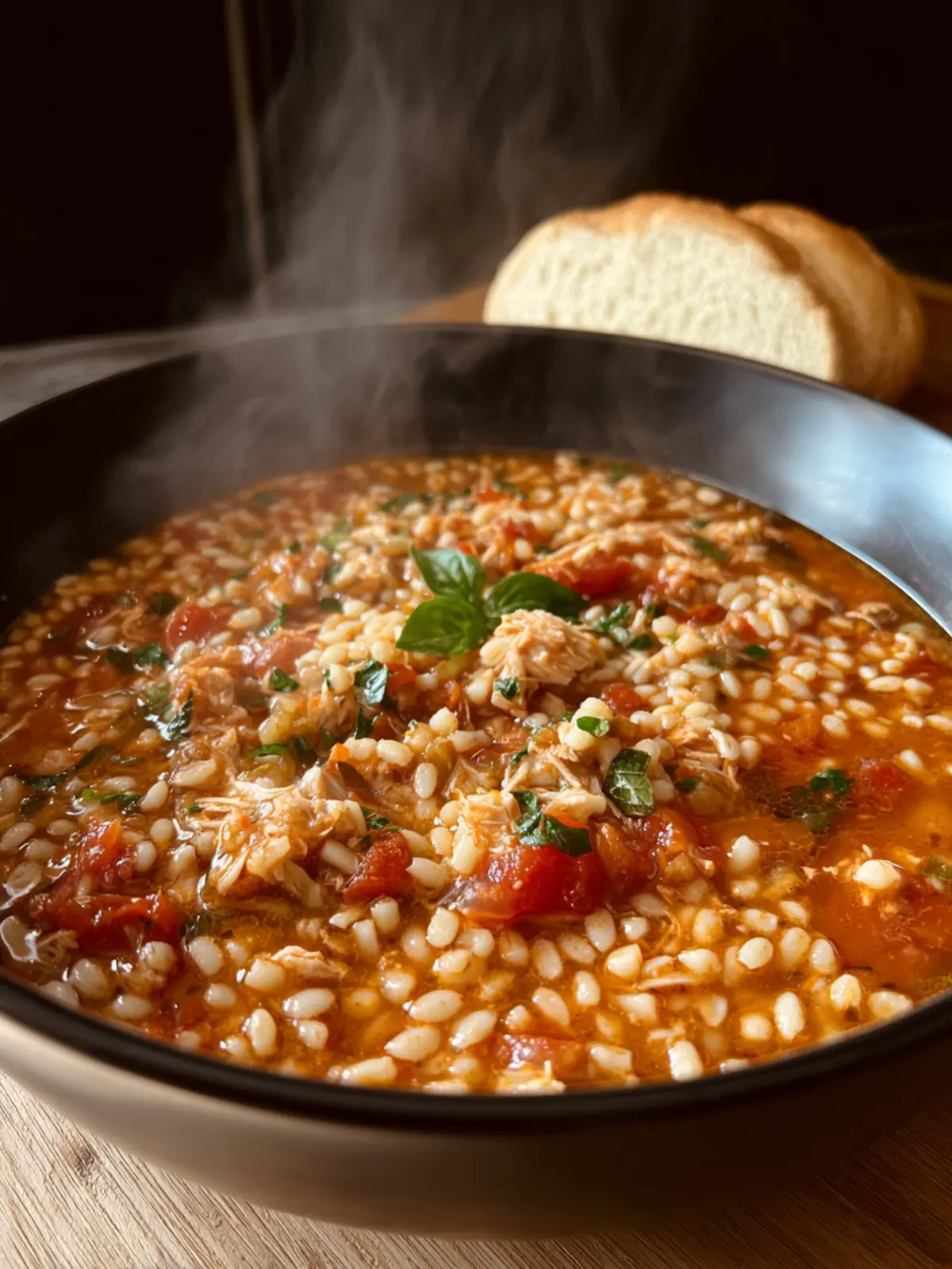 A warm and hearty soup made with shredded chicken, acini di pepe pasta, and a medley of vegetables.