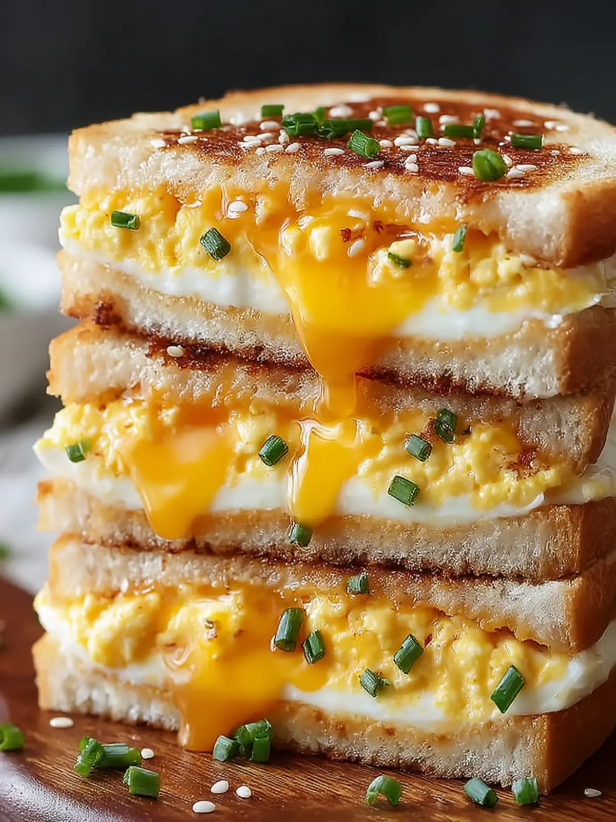 - Spread a generous amount of the egg mixture onto two of the bread slices. Top with the remaining slices to create sandwiches.