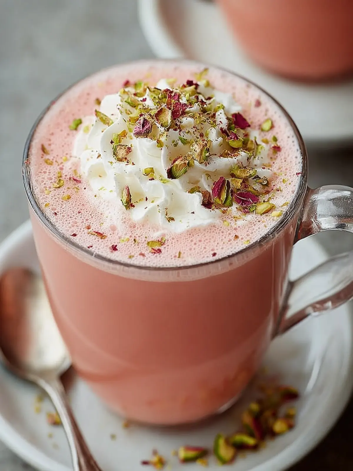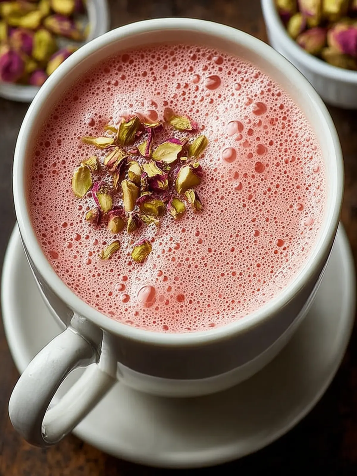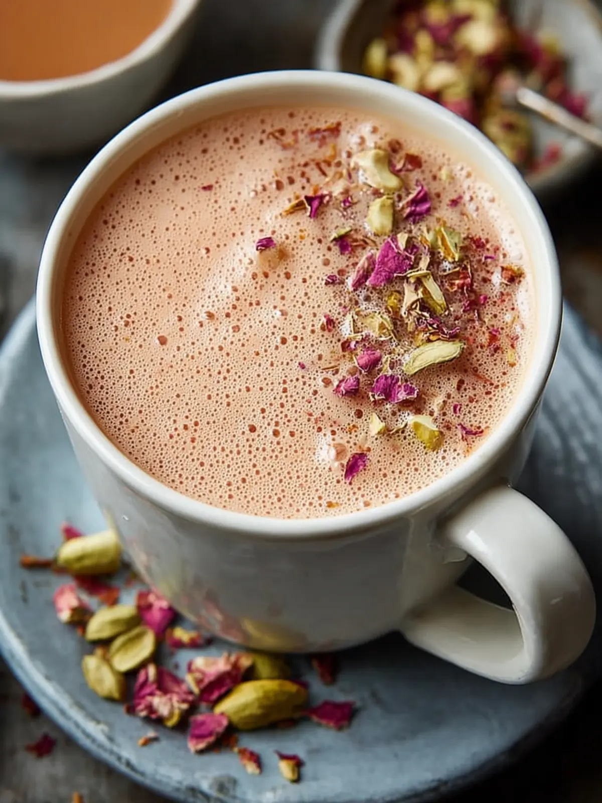 Crushed pistachios: If you’re looking to add a touch of elegance, consider using crushed pistachios as a garnish. They provide a delightful crunch and a pop of color, making your Kashmiri Pink Tea visually stunning as well as delicious.