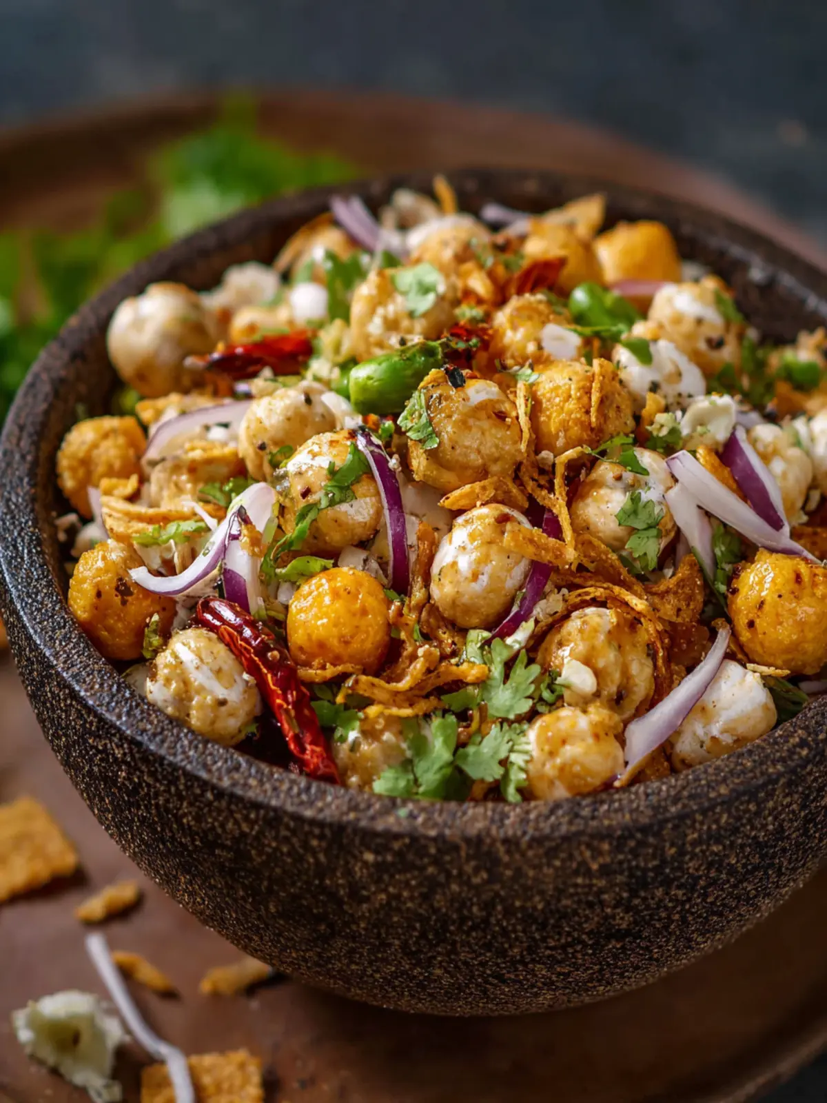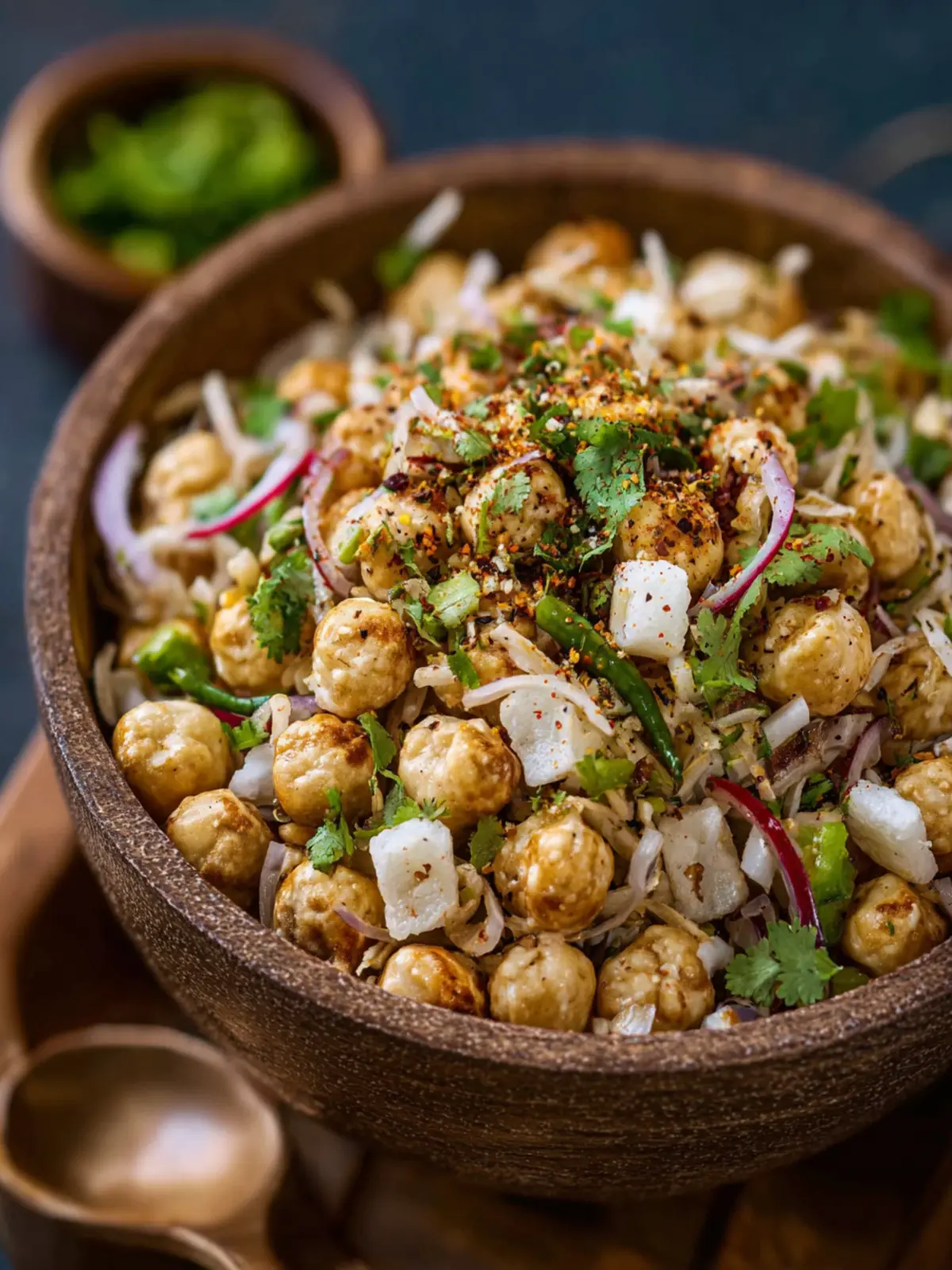 A delicious and crunchy snack made with roasted makhana, vegetables, and chutneys.