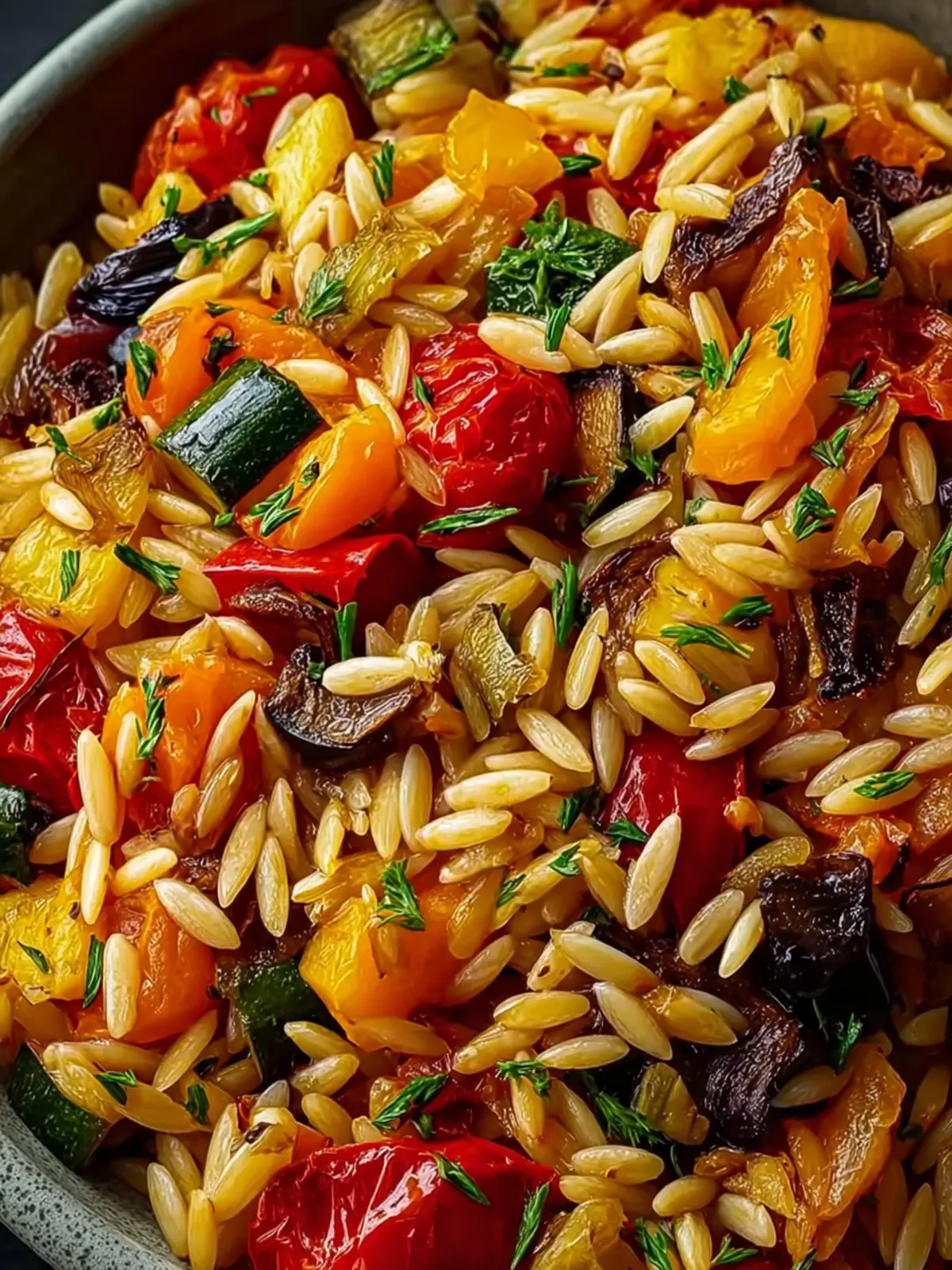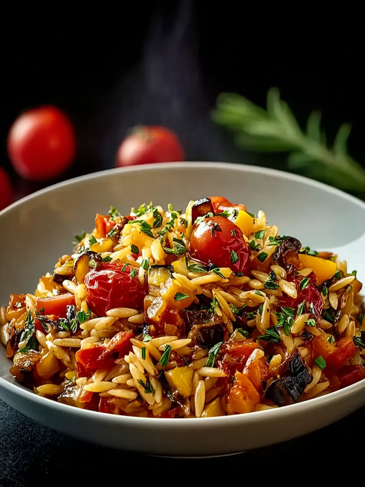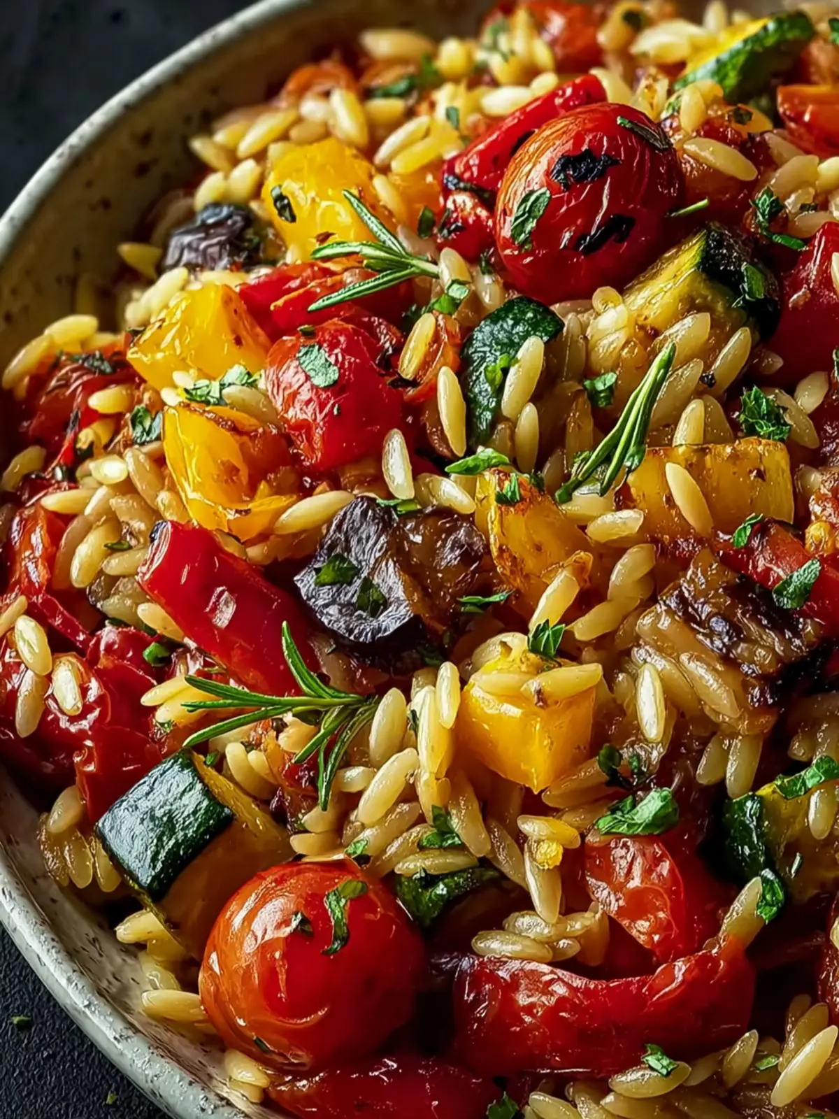 A delightful roasted vegetable orzo pasta dish seasoned with Italian flavors.