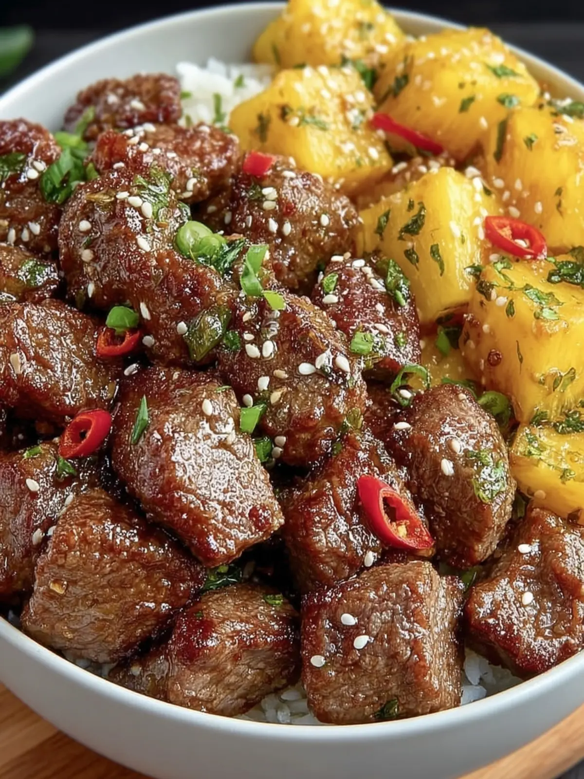 - Assemble the Bowl: In serving bowls, arrange the cooked beef and pineapple chunks. Garnish with freshly chopped parsley or cilantro.