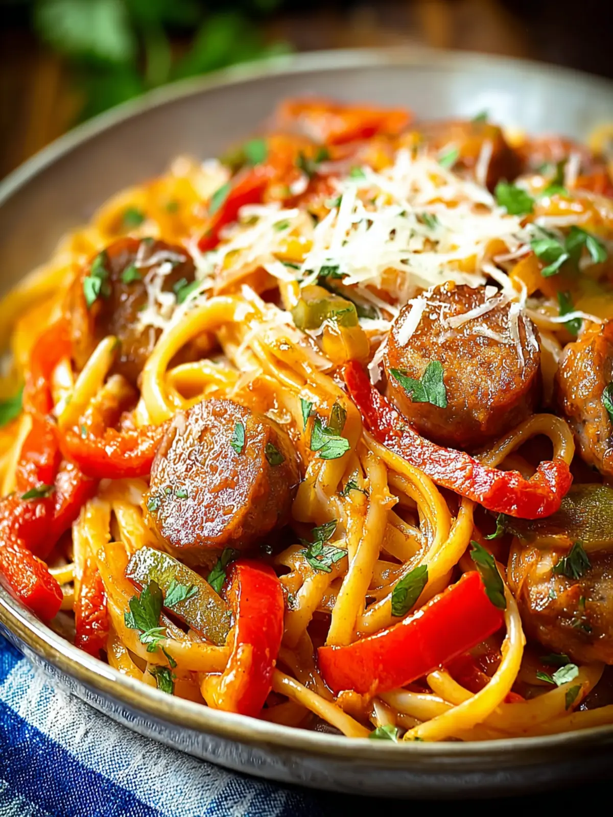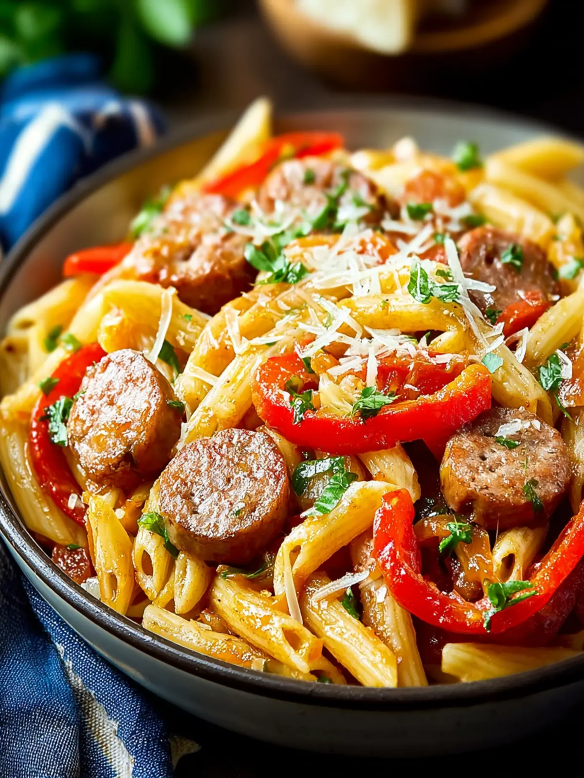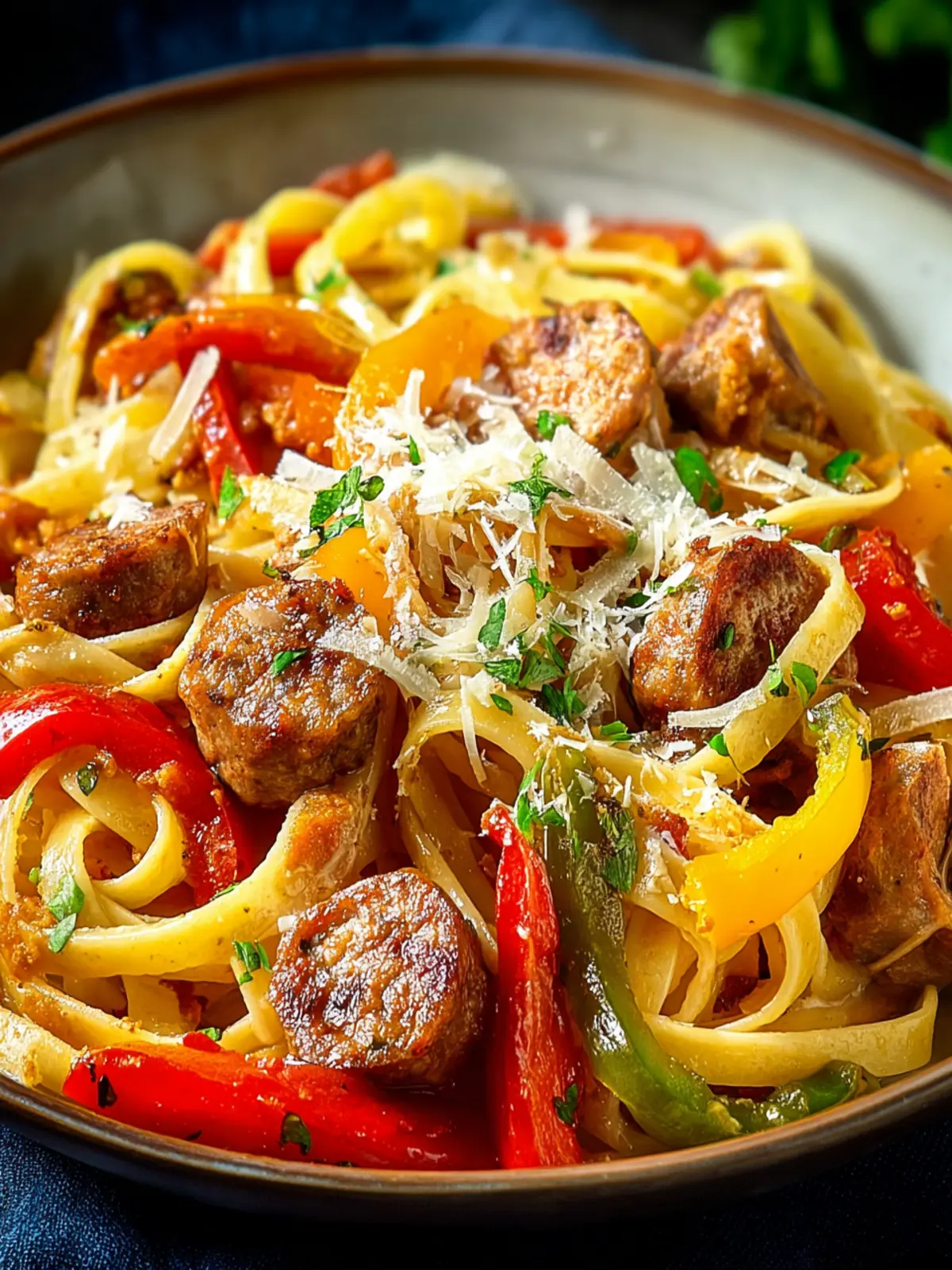 A delicious pasta dish featuring Italian sausage and colorful bell peppers.