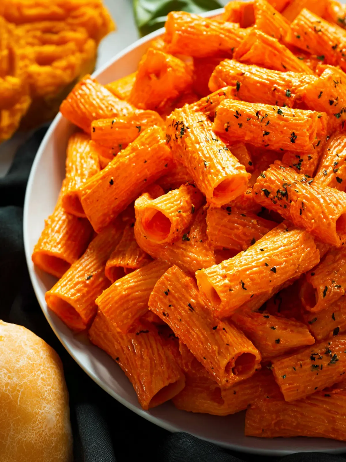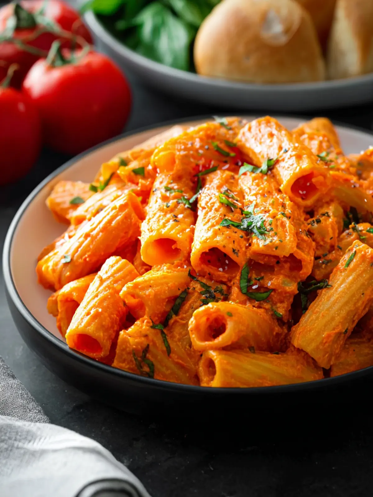 For an Instagram-worthy presentation of your vegan creamy tomato rigatoni pasta: